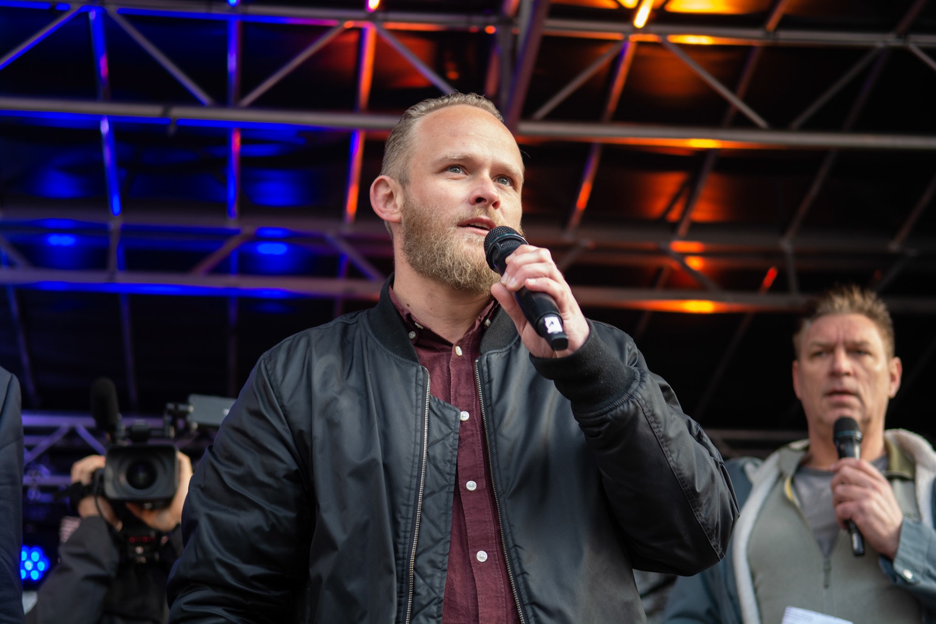 Peter Kwint (SP) en Paul van Meenen (D66) in de bat op podium tijdens leraren staking in Den Haag