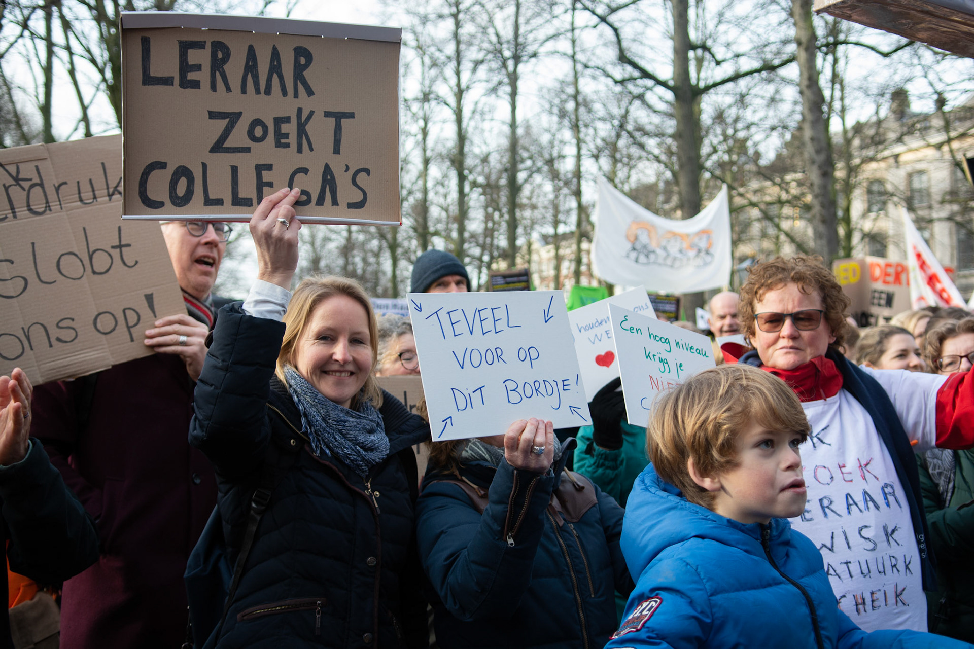 Leerling staat tijdens de lerarenstaking met bord ik wil goet onderwijs