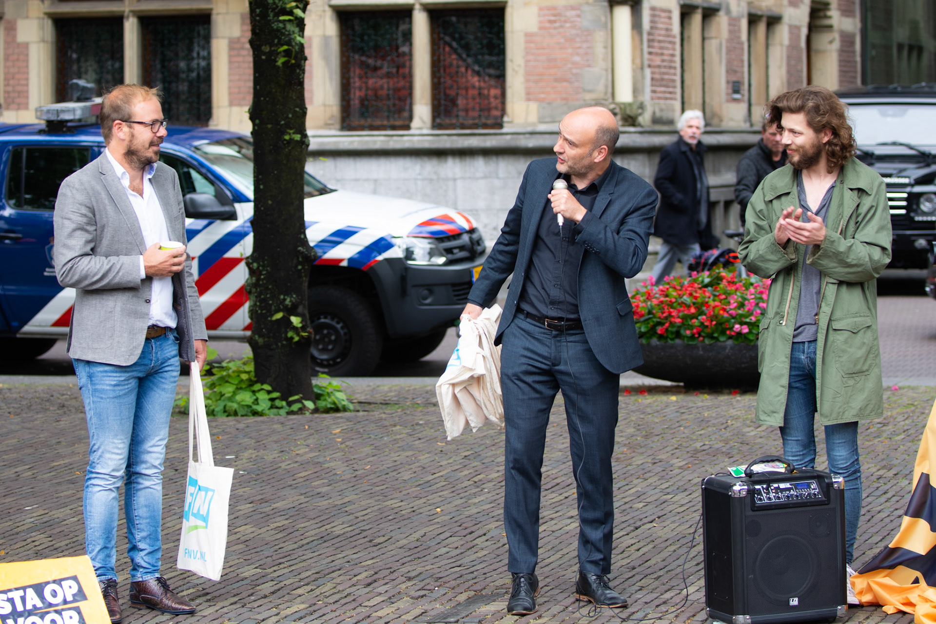 Bij een kleinschalige 1.5 meter demo op het plein in Den Haag kwamen mensen bij elkaar voor een hoger minimumloon.