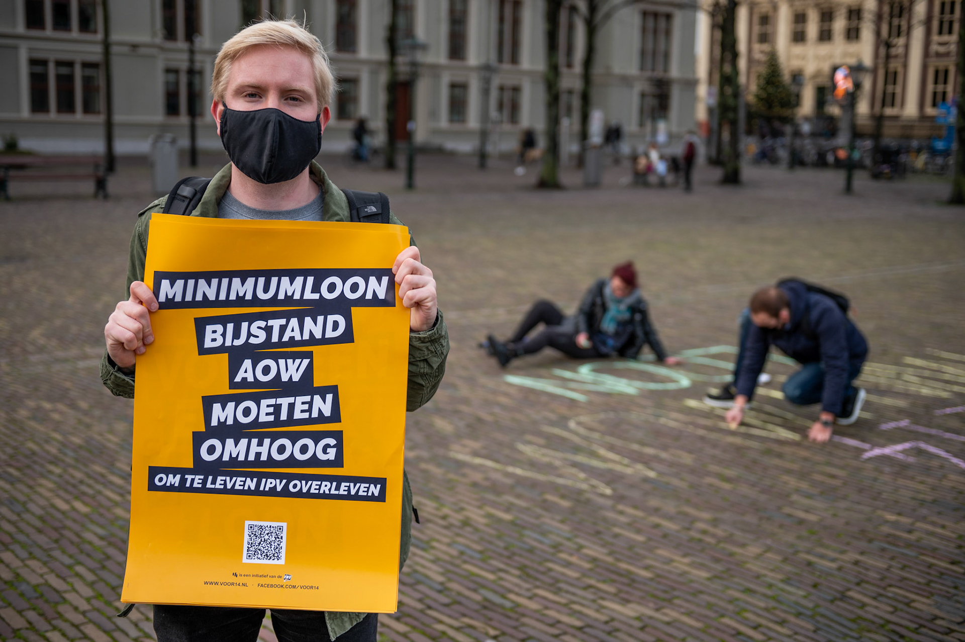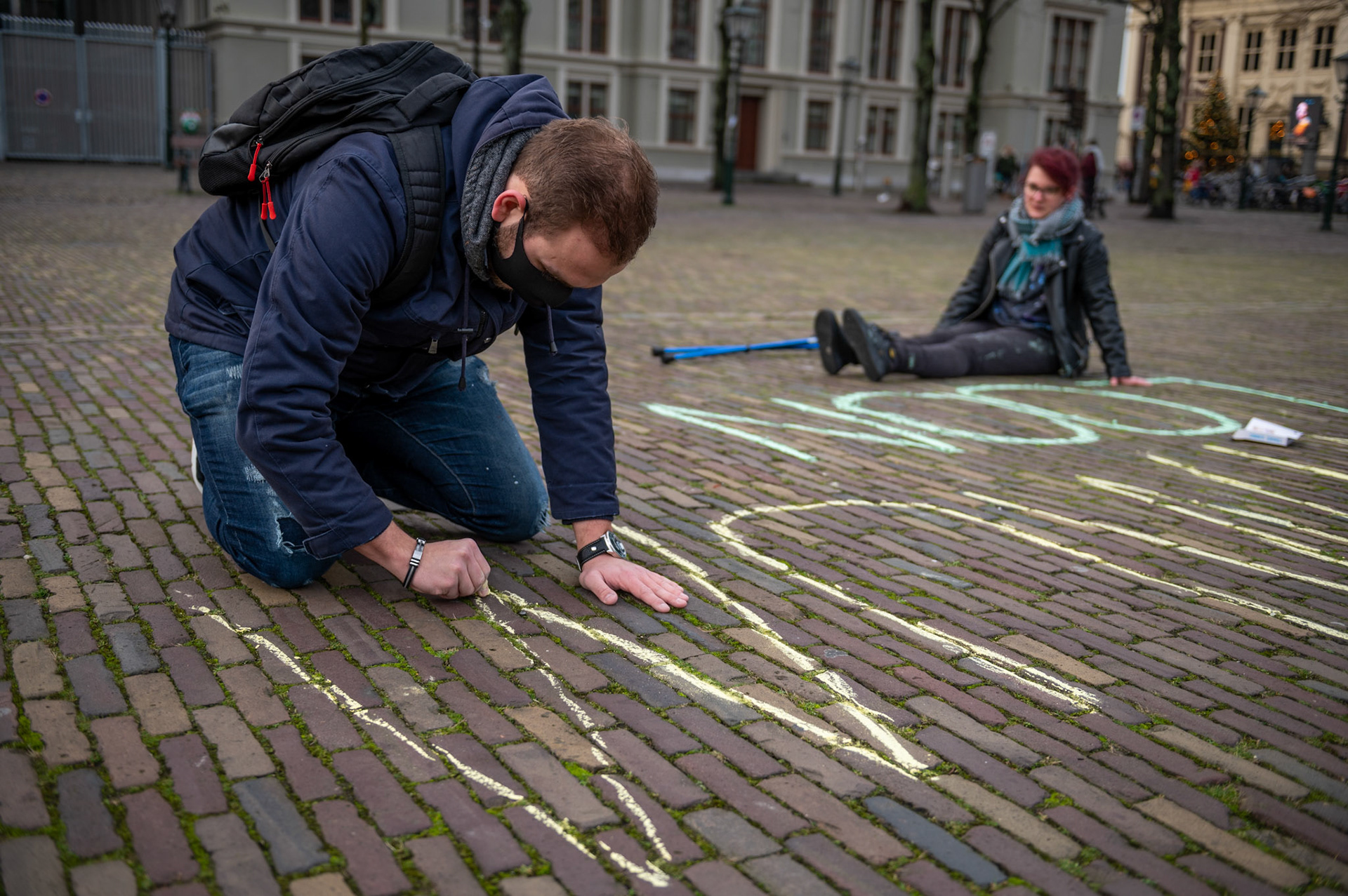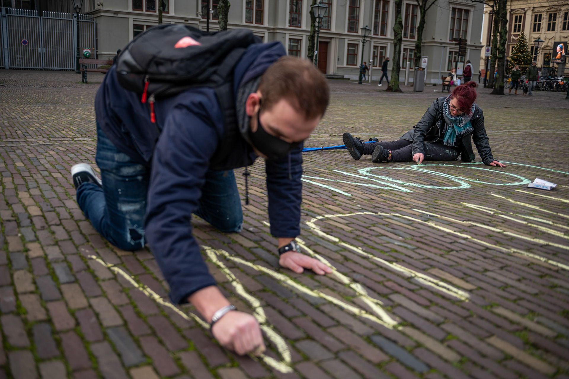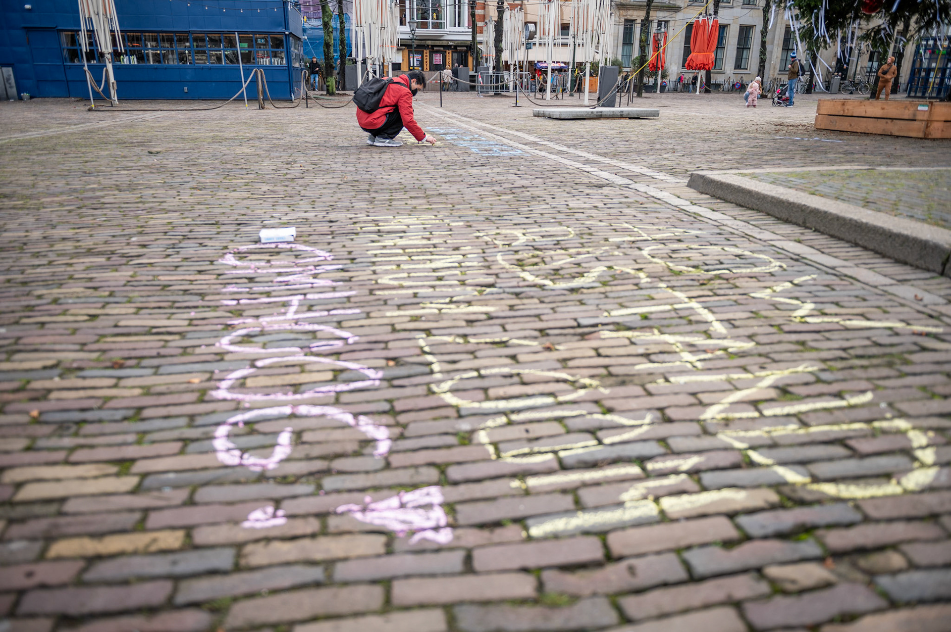 Vandaag krijten activisten van Voor14 leuzen op de grond in Den Haag. Voor 14 strijd voor een verhoging van het minimumloon naar 14 euro per uur.