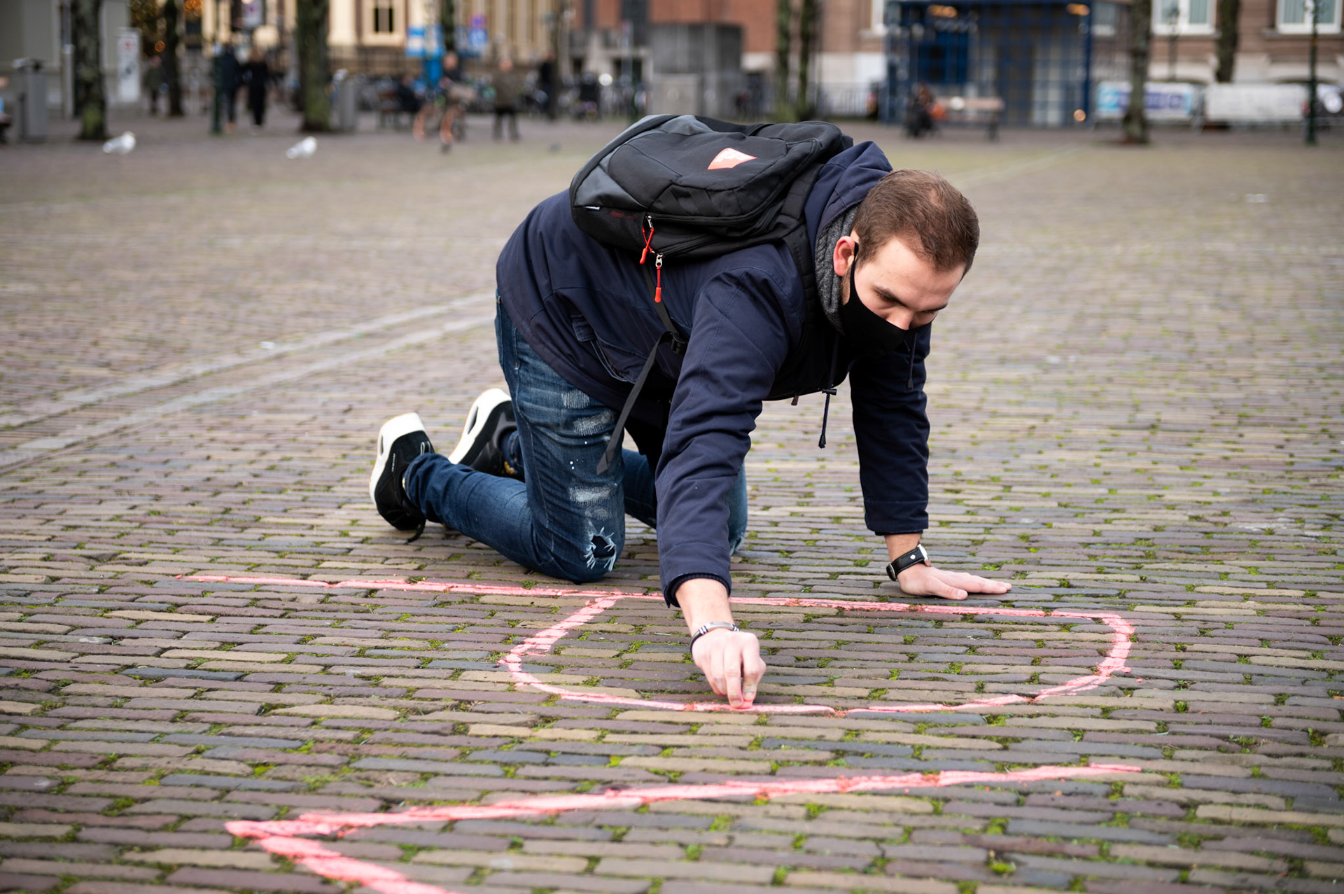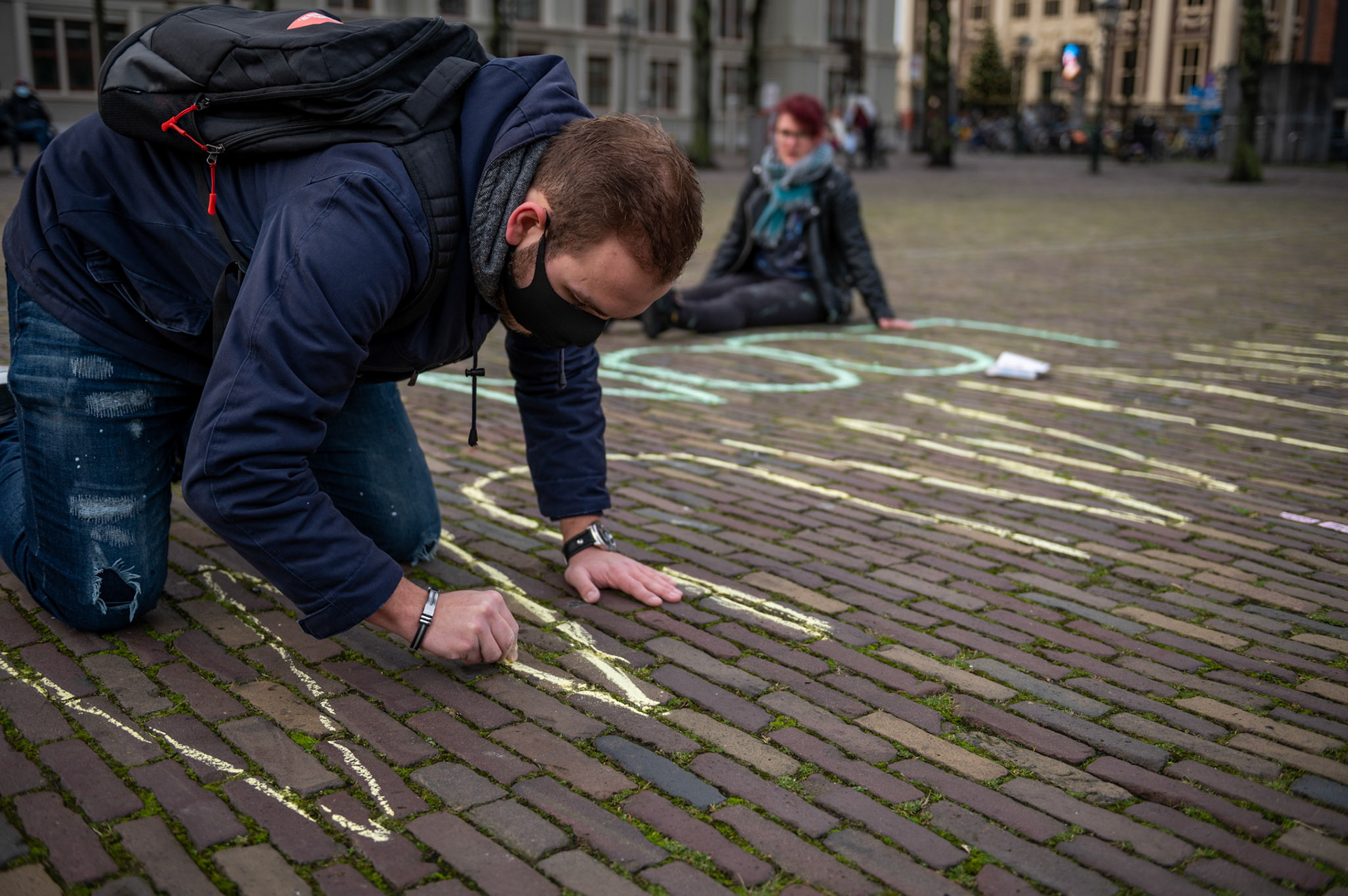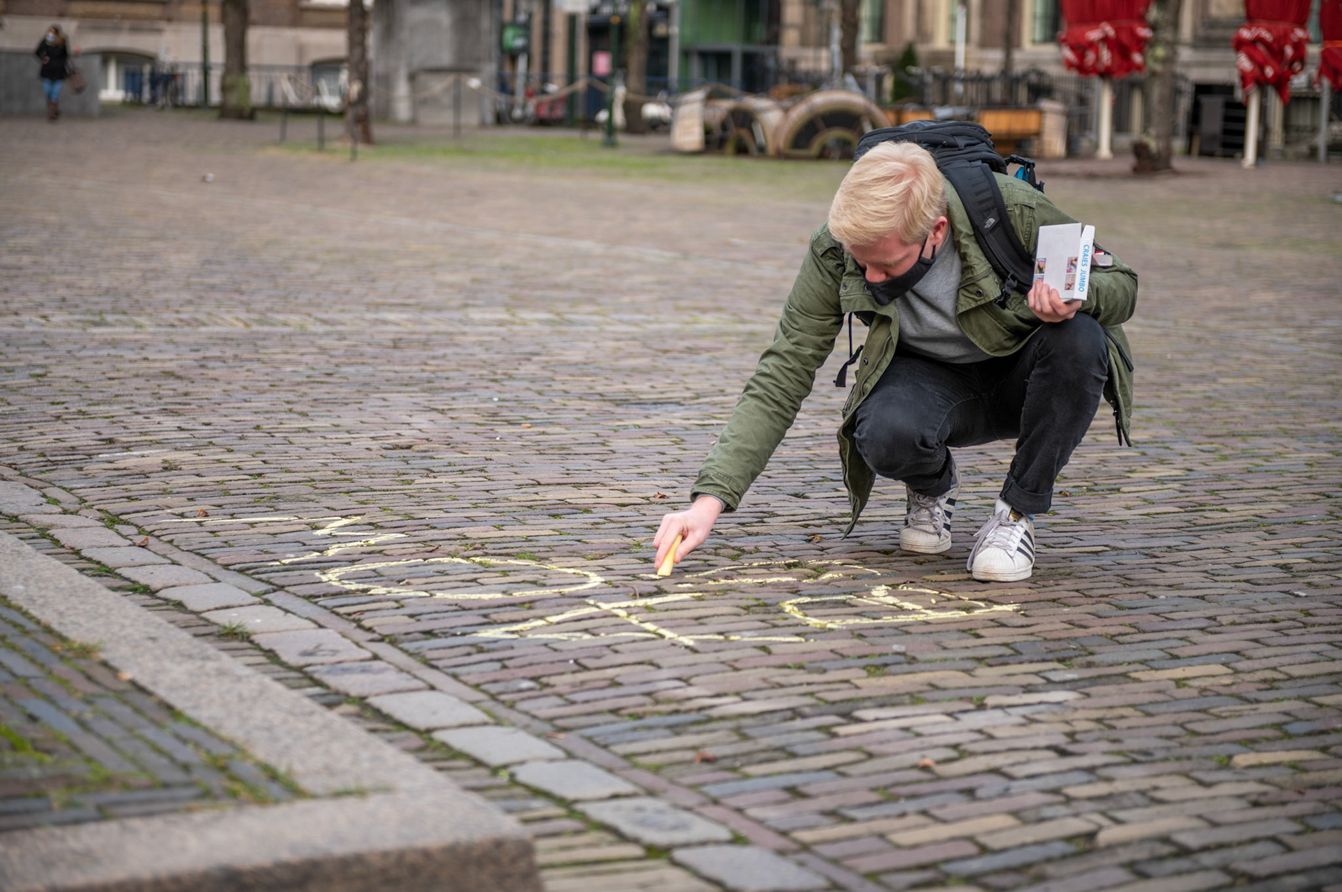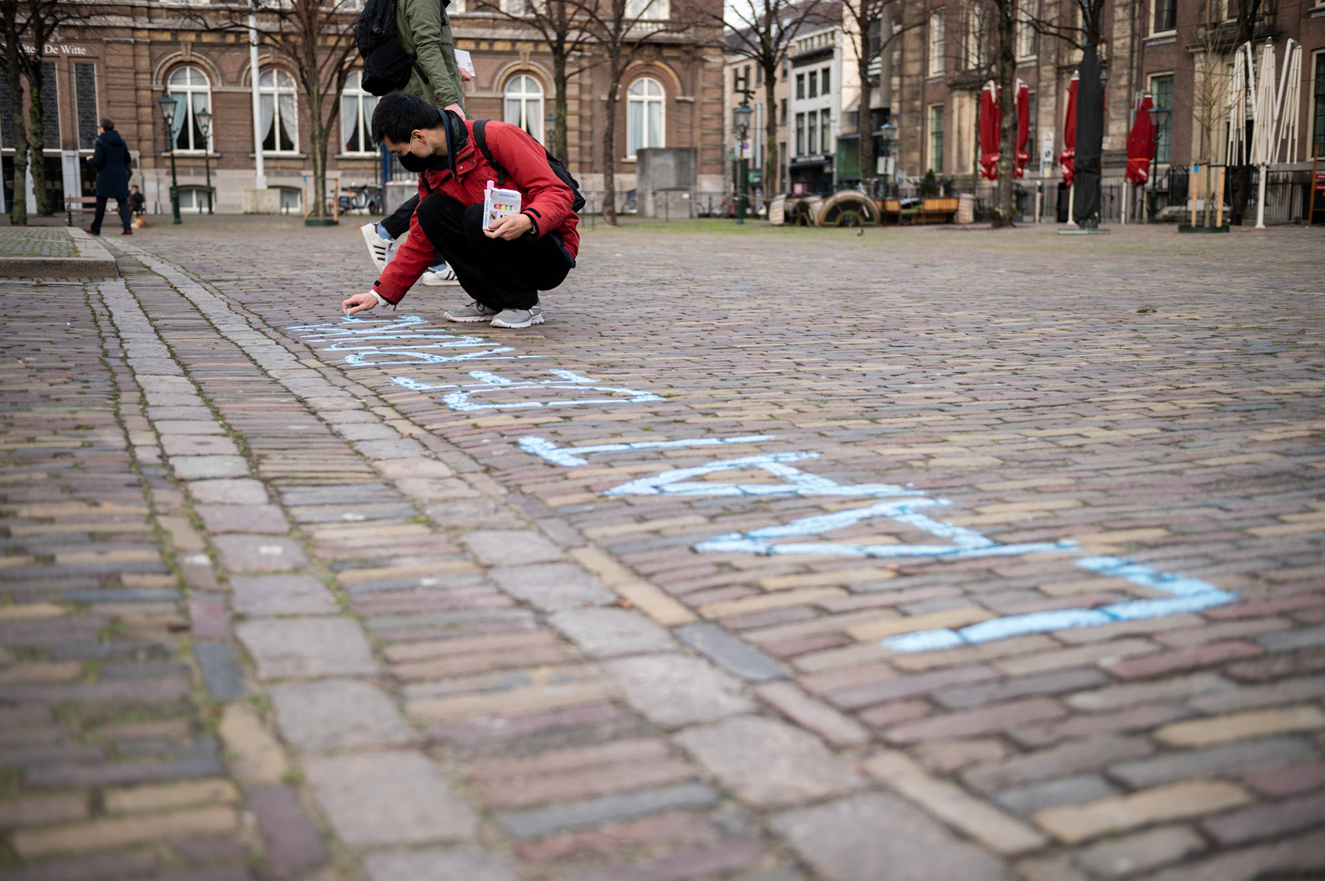 Vandaag krijten activisten van Voor14 leuzen op de grond in Den Haag. Voor 14 strijd voor een verhoging van het minimumloon naar 14 euro per uur.